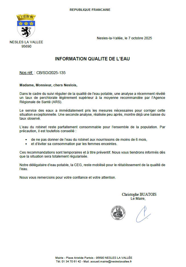 INFORMATION IMPORTANTE : qualité de l’eau